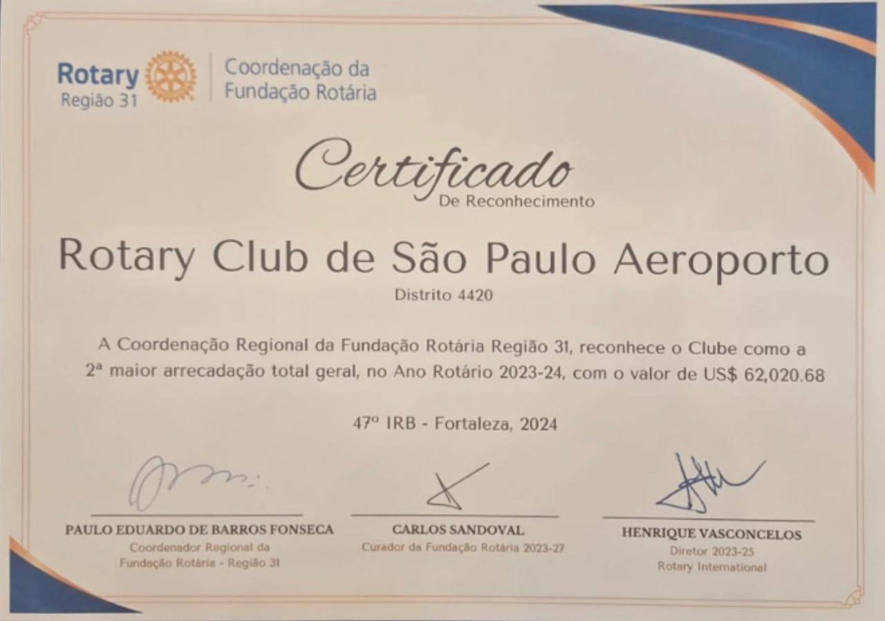 Durante o 47° Instituto Rotary do Brasil, realizado em Fortaleza (CE), o Rotary Club de São Paulo-Aeroporto foi reconhecido pela Coordenação Regional da Fundação Rotária - Região 31 por seu destaque em arrecadações no ano rotário 2023-24. O clube recebeu dois certificados de reconhecimento, celebrando sua contribuição significativa para os fundos da Fundação Rotária.