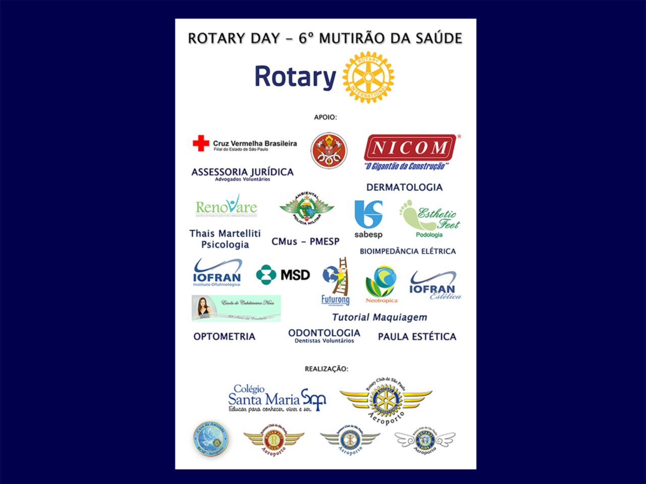 O Rotary Club de São Paulo Aeroporto realizou no sábado 13 de Setembro o Mutirão da Saúde, em parceria com o Colégio Santa Maria. No evento foram prestados serviços de saúde para a comunidade da região sul da cidade de São Paulo, incluindo familiares dos alunos do curso de alfabetização de adultos e comunidades carentes da região.