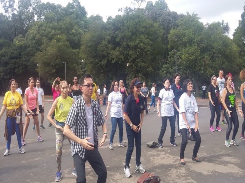 A garoa impediu a caminhada, porém foi substituída por execícios de alongamento e aeróbicos realizados pelo grupo DANCE+.