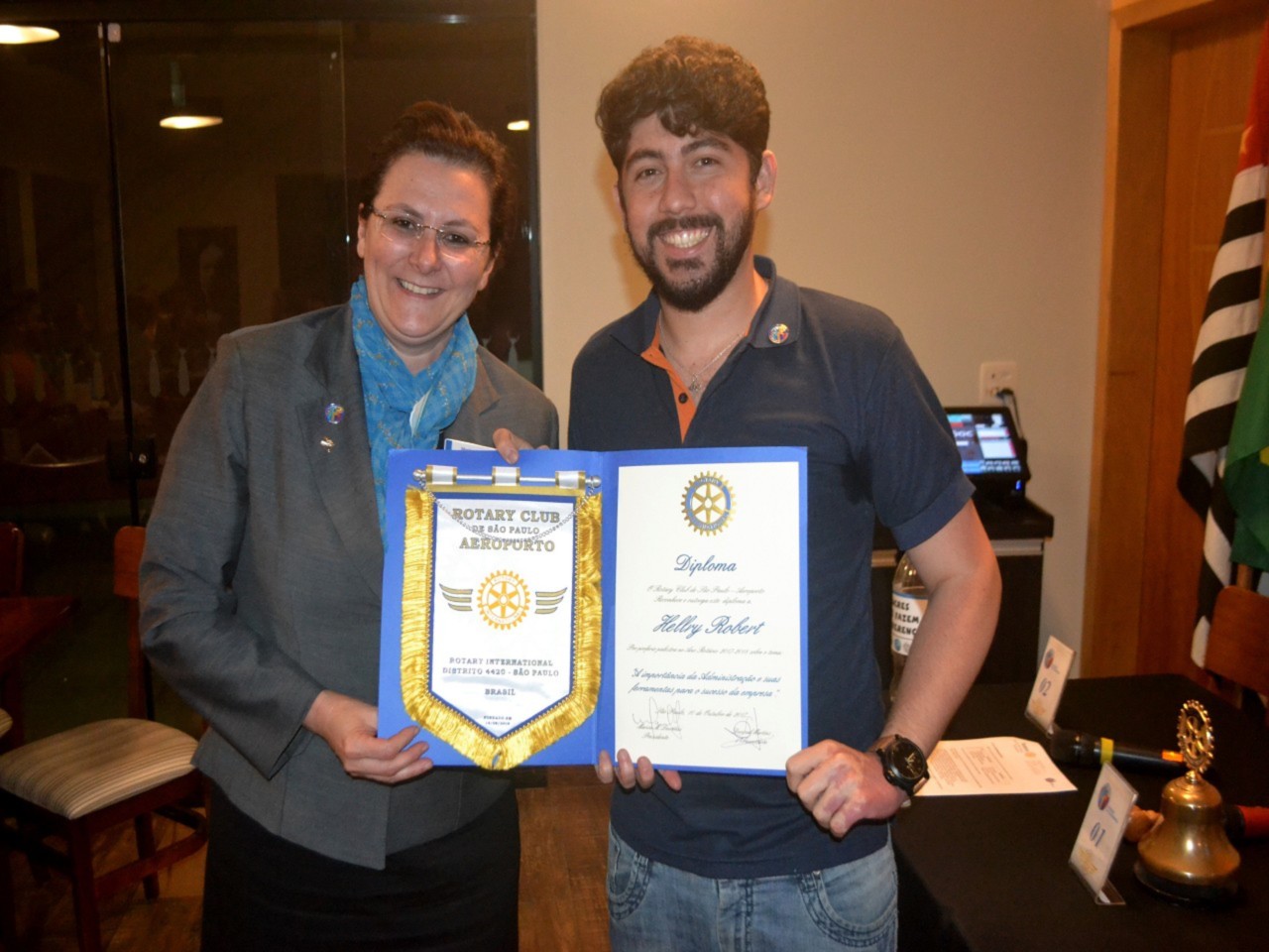 Citando outras ferramentas e exemplos da boa administração, com muito carisma e clareza, Hellry concluiu sua apresentação e foi agraciado com um certificado, entregue pela presidente Marisa Dascenzi, que fez a outorga em reconhecimento à apresentação do jovem rotaractiano associado do Rotaract Club de São Paulo-Independência, que atualmente ocupa a função de 2º Secretário do ano rotário 2017-18 no seu clube.
