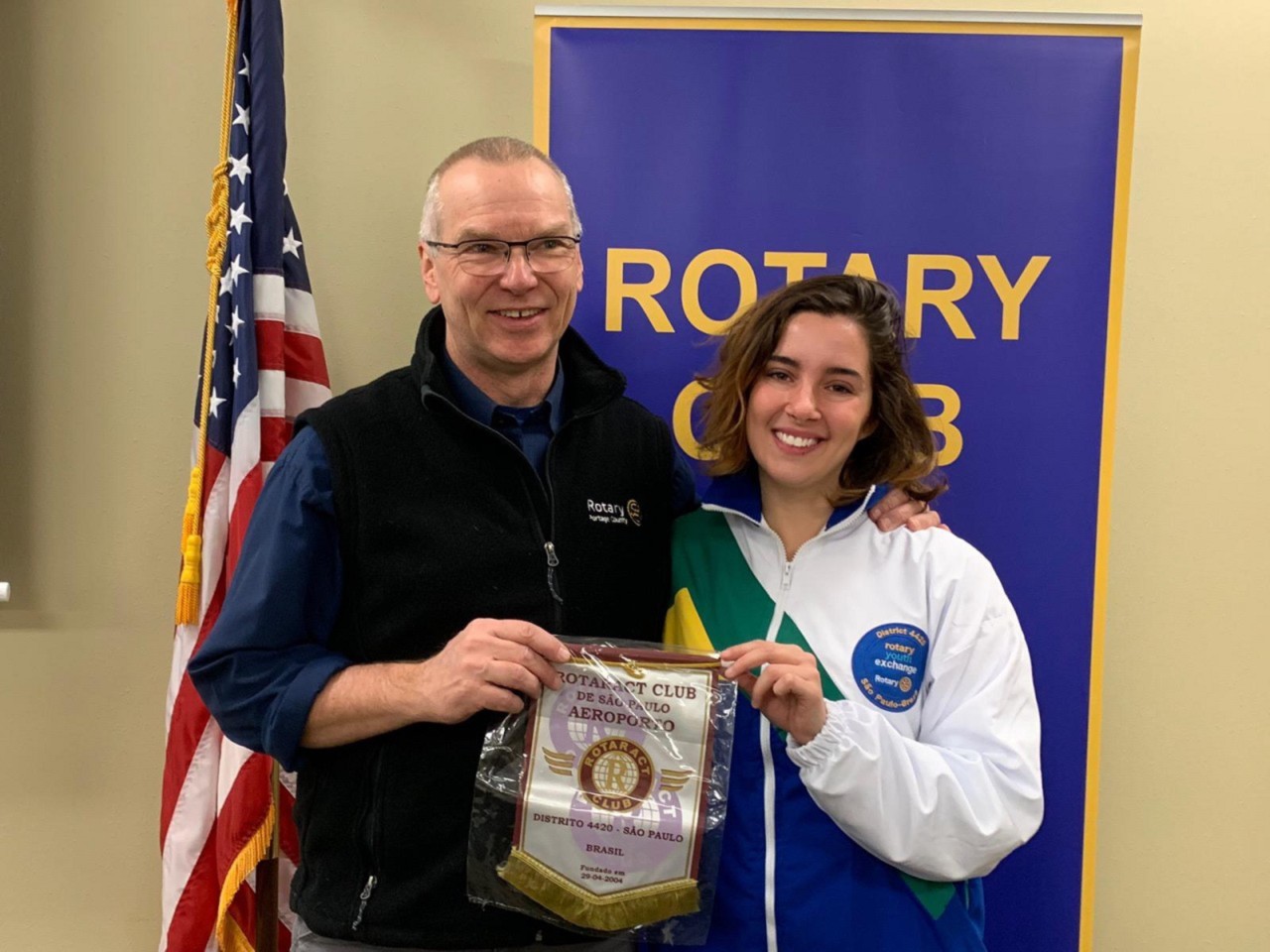 A presidente do Rotaract do Aeroporto, Giulia Priore, durante vista aos Estados Unidos, apresentou palestra no Rotary Club de Wisconsin USA sobre o projeto Pioneiro do Exchange Program que uniu durante todo o ano os intercambistas do Distrito 4420. Também falou sobre nossos clubes, nosso distrito e do nosso querido Brasil . A presidente Gulia ainda presenteou nossos companheiros americanos com flâmula do RCSP Aeroporto.
